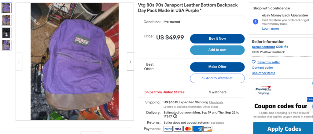 There’s a lot of material here but for now let’s just focus on the shipping quote we got for a zip code across the country from Washington state. Assuming this won’t fit in a flat rate padded envelope (which is considered expedited by the way) we would expect the shipping to be around ten dollars. For sixty-eight dollars and change we would expect it to be delivered to our front door by a man wearing white gloves who hopped out of a limousine. The backpack itself is a mere fifty dollars (take a penny). However, they do have Make an Offer. Conceivably you could offer them a single penny for this item and still they would make a nice profit. In fact if we were listing this item we would probably list it for far less than that.