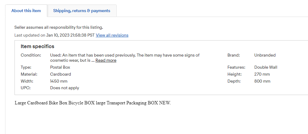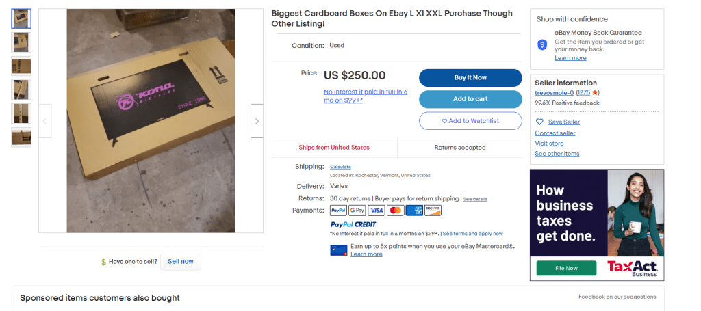 Speaking of boxes, here you have a clearly used rebranded television box being sold as a new bicycle box per the description. Kona bicycles are a real brand. Their graphics on this box are certainly interesting.