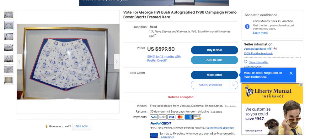 These are boxers. Not briefs. According to the unverified lore in the description these were a gift directly from George H.? What an odd gift. We also wanted to mention that the profile pic for the seller reminds us of our dentist.